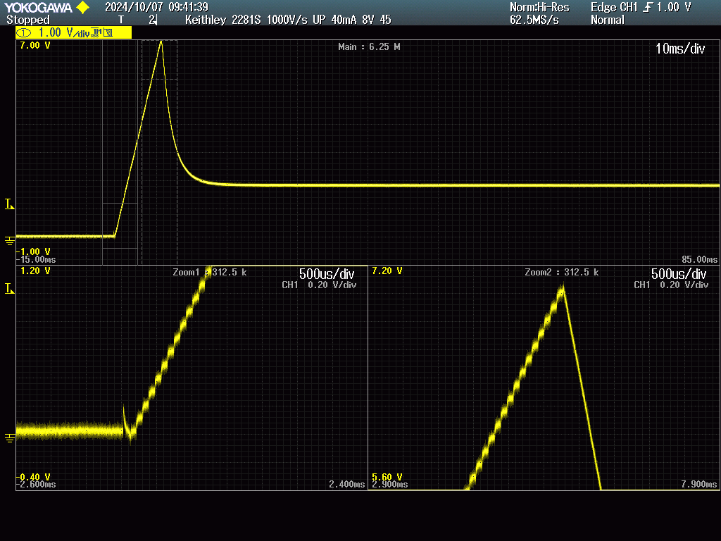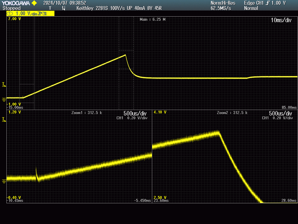 However I don't think this is caused by output capacitor discharge, the waveforms don't match. As indicated by the stairstep and correct slew rate, the upslope is within the PSU control loop and the PSU should be able to control its output. It just doesn't appear to control the current until a certain time after output is enabled.