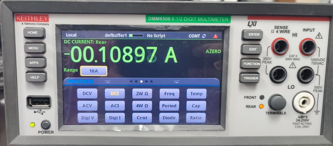 I am facing overflow issues in direct measurements (DCI) with Keithley's DMM6500.  While I have overflow issues for currents upto 3A range on both the front and rear panels, I am able to measure the current on the 10A pin on the rear panel (for reference see the attached image).