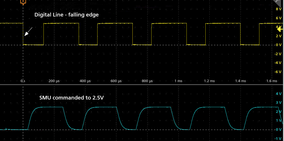 Combining this info about the source output and my prior suggestion about using a function to reduce bus traffic, I'm seeing less then 40usec from the DIO changing state and the start of the SMU source level changing.